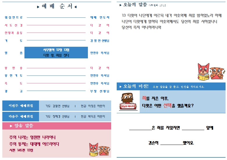 [성경본문] 사무엘하12:12-14절 개역개정12. 너는 은밀히 행하였으나 나는 온 이스라엘 앞에서 백주에 이 일을 행하리라 하셨나이다 하니 13. 다윗이 나단에게 이르되 내가 여호와께 죄를 범하였노라 하매 나단이 다윗에게 말하되 여호와께서도 당신의 죄를 사하셨나니 당신이 죽지 아니하려니와 14. 이 일로 말미암아 여호와의 원수가 크게 비방할 거리를 얻게 하였으니 당신이 낳은 아이가 반드시 죽으리이다 하고